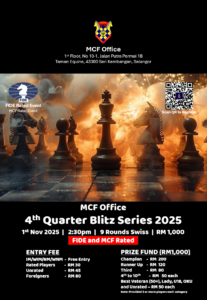 The final leg of the MCF Blitz Series 4/2025 will be scheduled on 1st November 2025 – Saturday, starting at 2:30pm at MCF Office in Seri Kembangan, Selangor.
