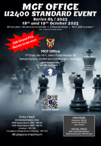 Planned to be held over 6 rounds (5 rounds if players are less than 16), the MCF U2400 series also offer a prize fund of RM1,400 to the eventual winners.